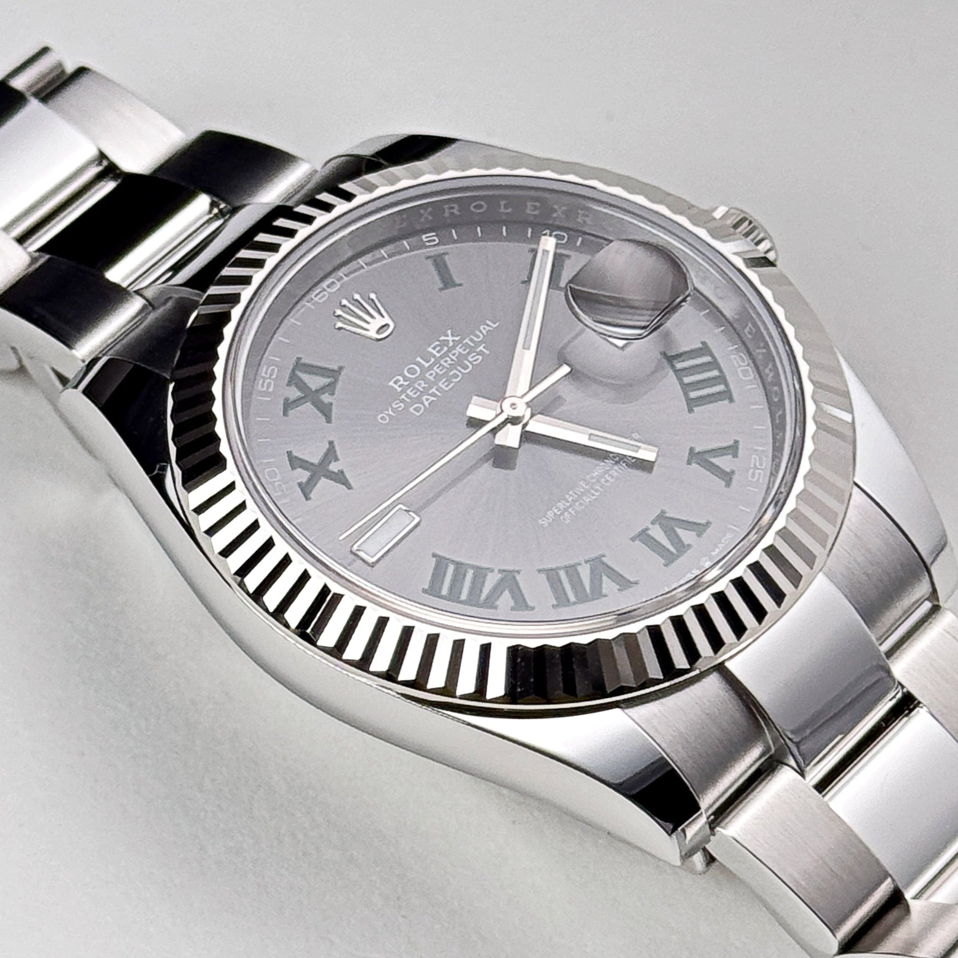 The 2025 Watch Datejust is designed with a 41mm stainless steel case. complemented by the signature stainless steel fluted bezel. and styled on an oyster bracelet. The slate dial hosts a date feature at 3 o'clock. Roman numeral hour markers in green are representative of the famous Wimbledon court. a place where and sports are perfectly paired. The 2025 Watch Datejust 126334 is a classic model and the next addition to your collection.