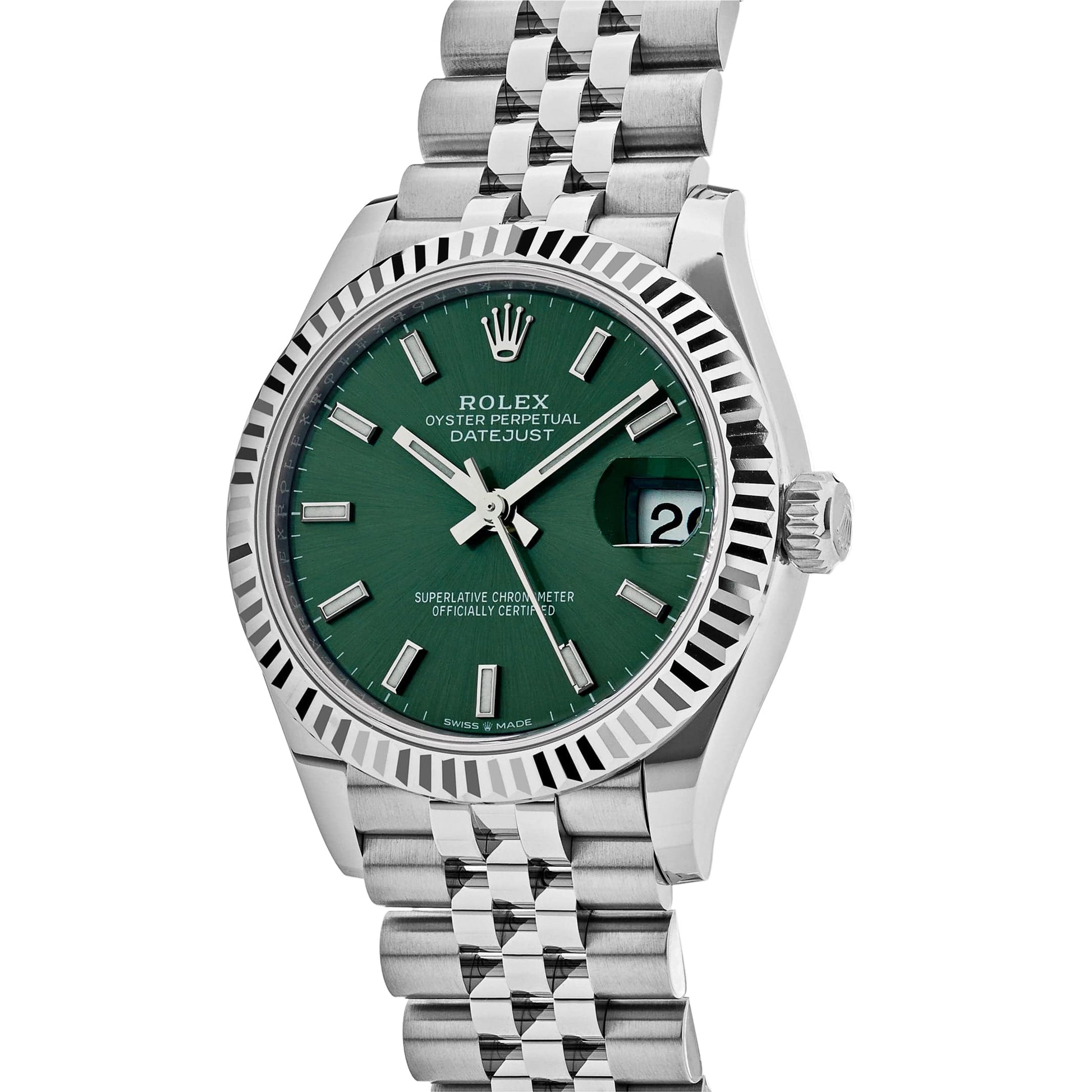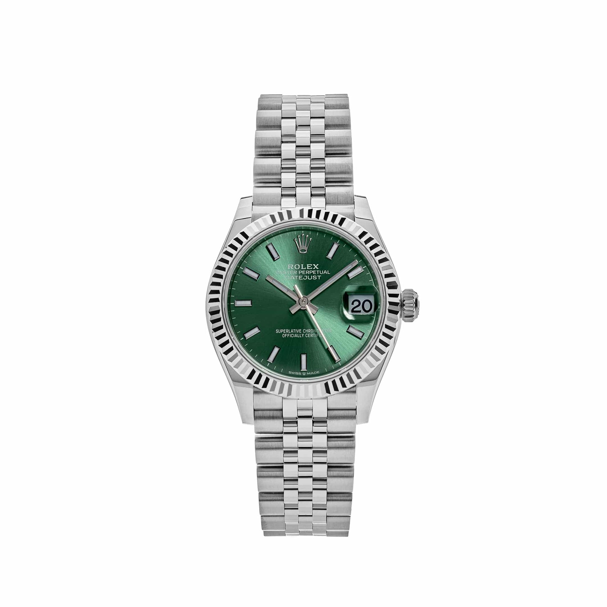 This 2025 Watch Datejust 278274 is designed with a 31mm stainless steel case. highlighted by a white gold fluted bezel. and styled on a steel jubilee bracelet. The vibrant green dial hosts luminous hour markers and hands and features a date display window. Whether you're out for a night on the town or heading to the office. this timepiece is a subtle and elegant choice that will surely be noticed.