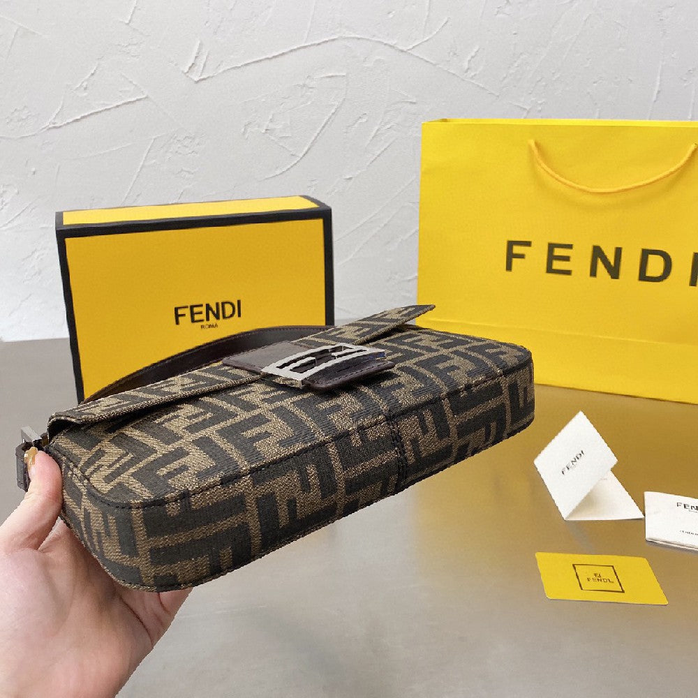 Made of brown jacquard fabric with FF motif, FF buckle closure and black embroidered trim. Featuring a front flap, magnetic closure, zip pocket, unlined interior compartment and gold-tone hardware. The bag has a detachable handle and patterned shoulder strap, so it can be carried by hand, over the shoulder or across the body.