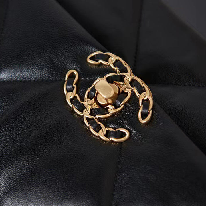 Introducing the Flap 19 Bag in classic black with gold hardware, a timeless addition to your wardrobe. This bag features a sleek and minimalist design, making it perfect for both casual and formal occasions.